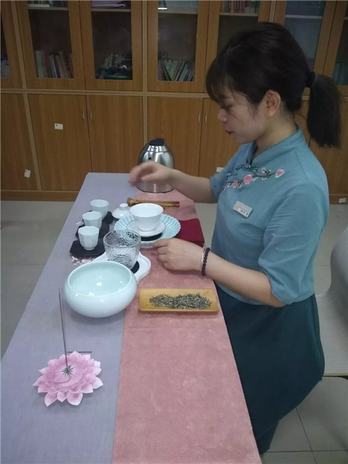 稍事休息,就進入到真實體驗環節——綠茶品茗互動。在甄老師講課的間隙,助理茶藝師已做好品茶的所有準備工作。