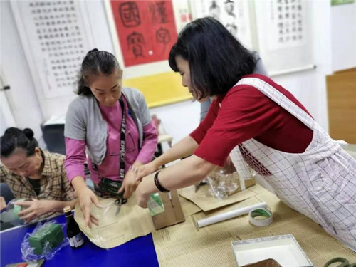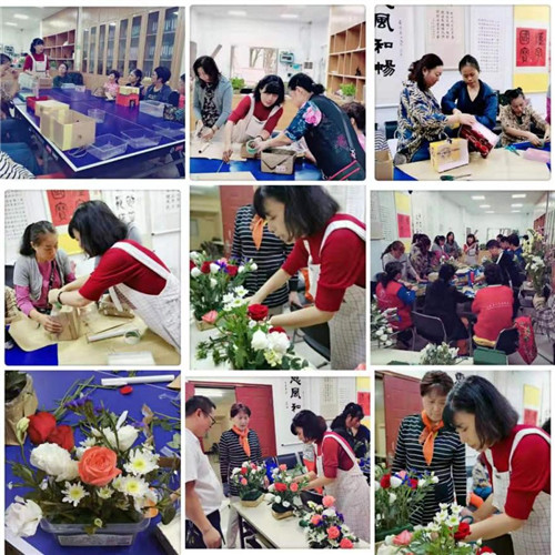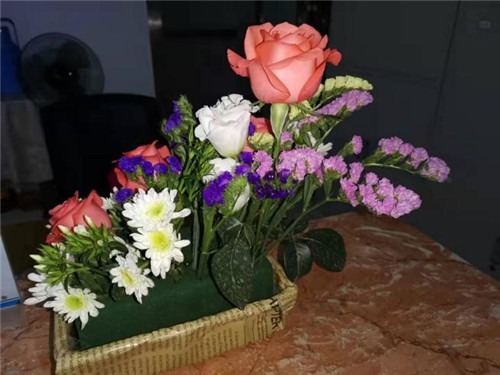 在居民們對(duì)花材有了基本認(rèn)識(shí)之后,甄老師就開始一邊操作一邊講授理論知識(shí),居民也跟著老師的節(jié)奏動(dòng)起手來。先把花泥用透明膠粘好,然后確定好骨架、主花、配花的品種與搭配,主花里面顏色深的、大的花朵插在下面的位置,小的、顏色淺的插在上面的位置。經(jīng)過一番努力,一會(huì)兒功夫,一盒盒色彩鮮艷、高低層次清楚的插花就完工了。