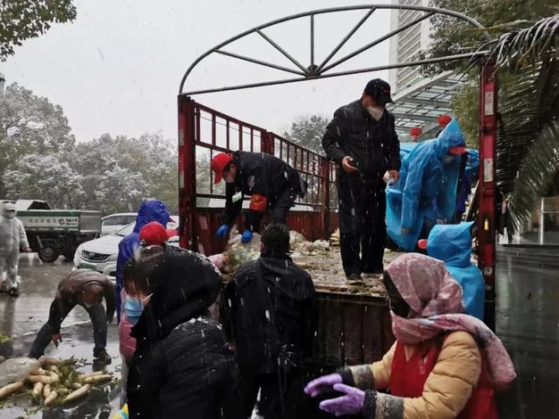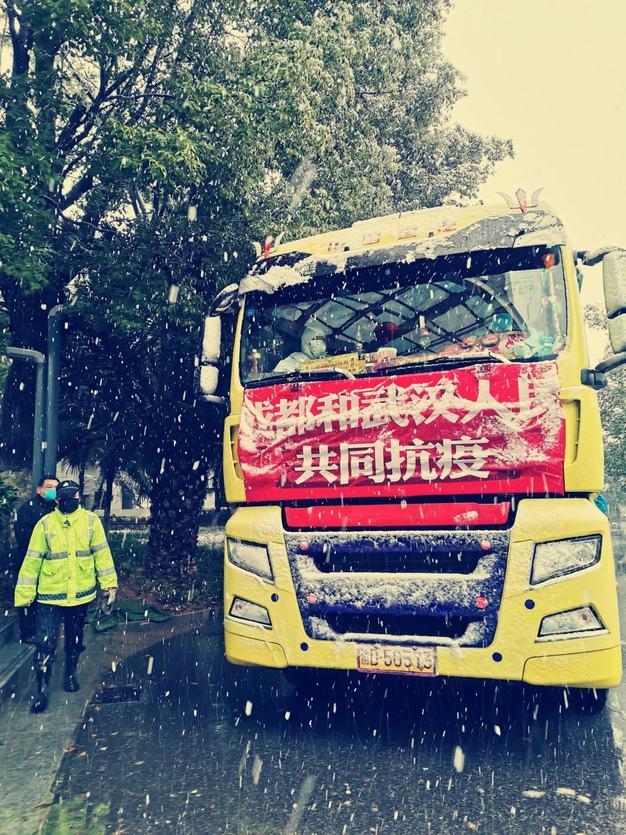 2月15日,成都愛心企業----合信置業帶著300噸防疫物資和新鮮蔬菜千里馳援武漢。在接到支援分發物資志愿者的請求后,“木蘭花人”無懼風雪嚴寒,緊急集結迅速協調,用近一天的時間,順利將5噸新鮮蔬菜全部分發給武漢市內20余個社區。