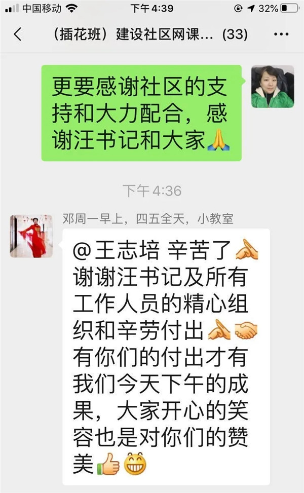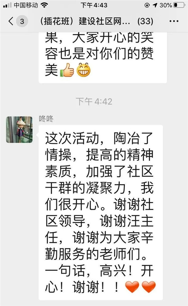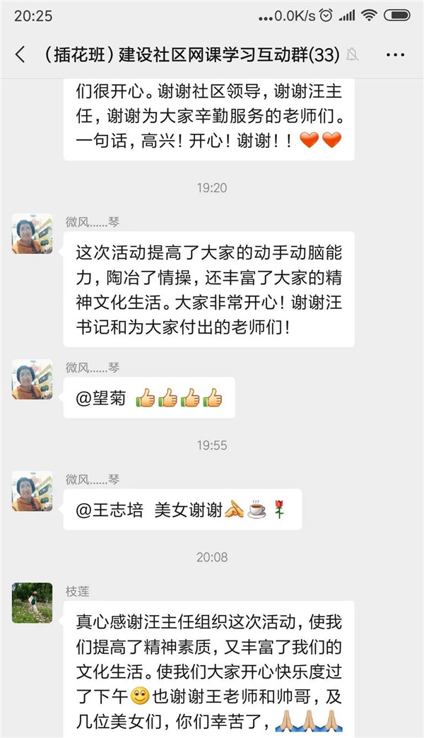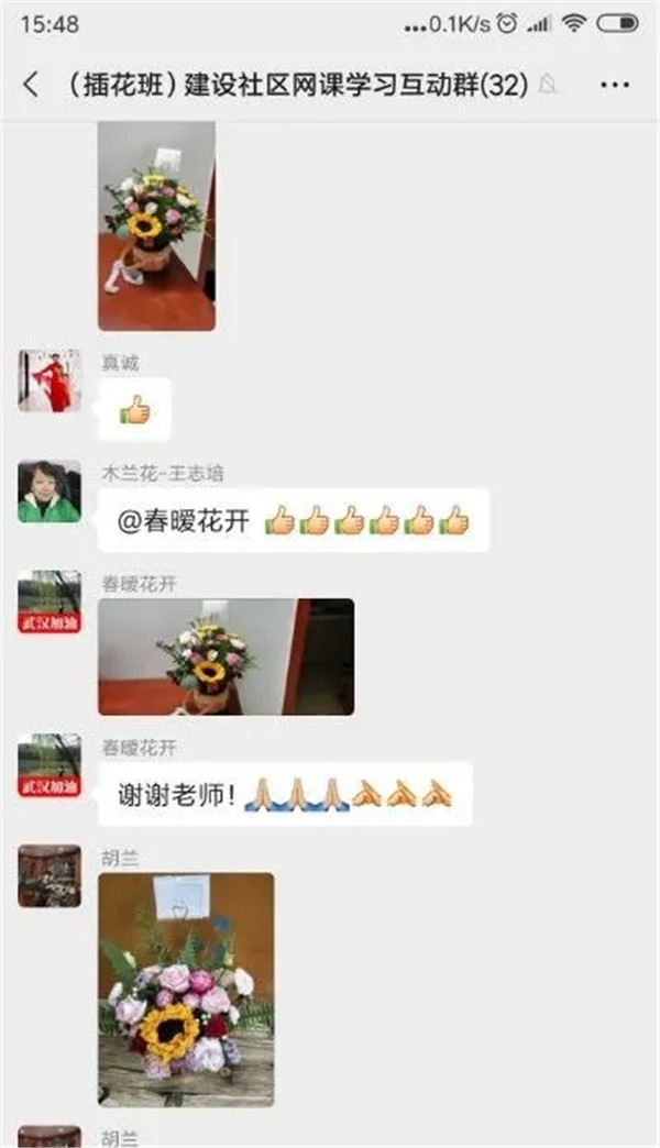 課程結(jié)束后,插花直播微信群內(nèi)的老年人們紛紛在群內(nèi)發(fā)布了自己的插花作品,對(duì)本次活動(dòng)稱贊絡(luò)繹不絕。現(xiàn)場參與活動(dòng)的老年人們也熱情的要求工作人員為她們拍攝照片,希望可以留作紀(jì)念。把活動(dòng)推向了高潮。