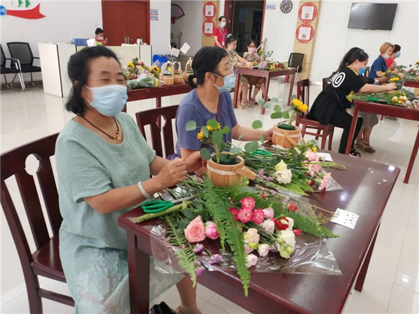 隨后參與活動(dòng)的老年居民們按照要求紛紛動(dòng)起手來,將原本普普通通的花材進(jìn)行精心修剪、整理,再根據(jù)不同的色彩、形狀進(jìn)行整合、裝點(diǎn)。不到1個(gè)小時(shí),活動(dòng)現(xiàn)場頓時(shí)花香四溢,琳瑯滿目。