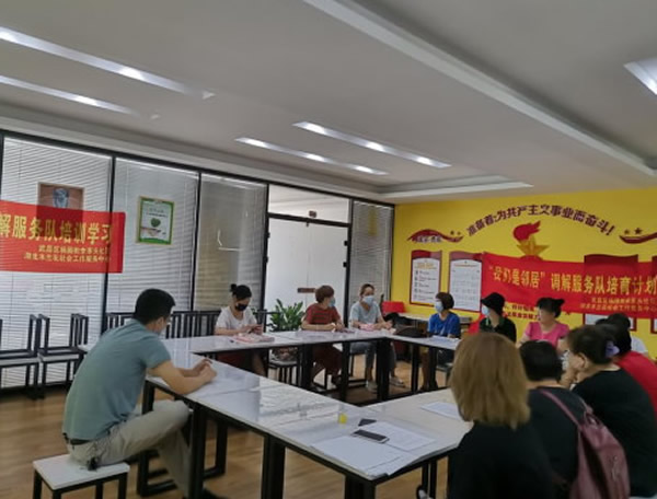 為了能夠及時發現和化解轄區鄰里之間的矛盾與糾紛,做到有問題及時上報居委會,鄰里矛盾能夠在居委會內部得到解決,防止矛盾激化形成更嚴重的社會問題,余家頭居委會于2020年8月20日攜手湖北木蘭花社會工作服務中心組織開展“我們是鄰居”調解服務隊培育啟動會。余家頭社區招募了10位古道熱腸、品行端正、熱愛志愿服務的黨員、熱心居民組建一支“調解志愿服務隊”,充分發揮他們在矛盾調處、民情聯絡等方面的獨特作用。