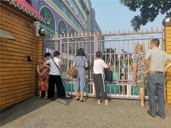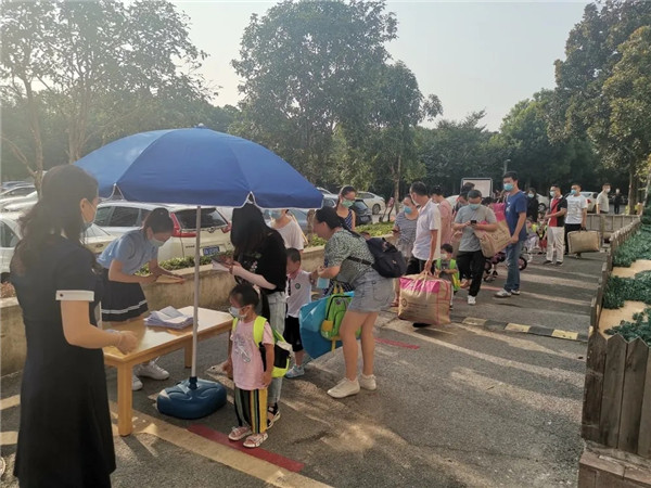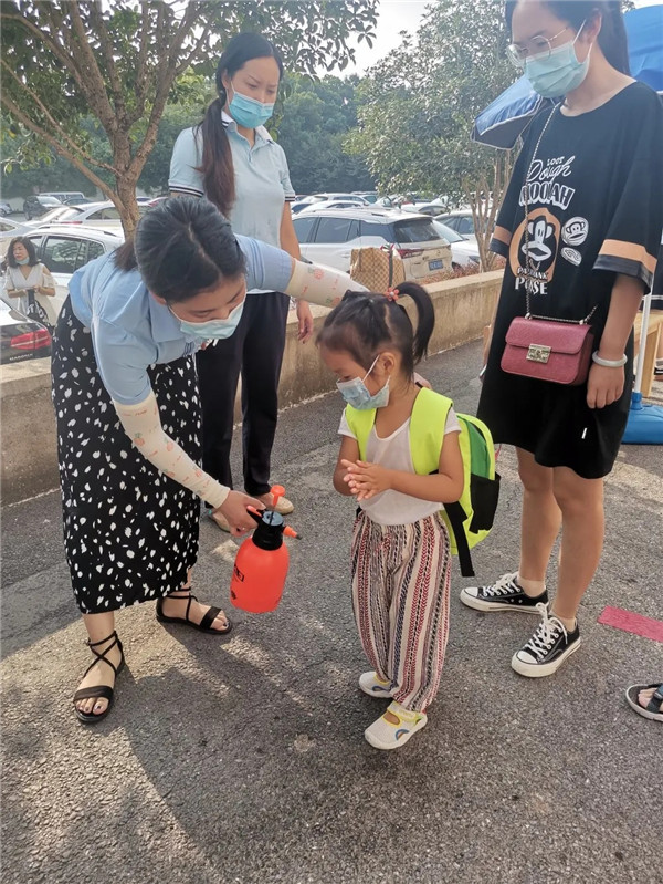 為保證安全,幼兒園實行錯峰入園。家長們按照要求遞交孩子的健康登記表,并完成測溫、消毒等一系列入園流程。