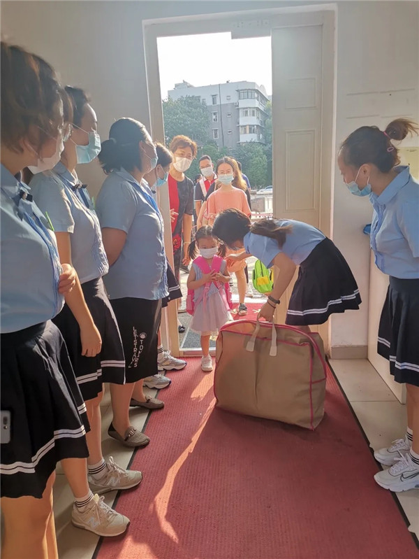入園第四步,告別家長,獨自入園。迫不及待想要與小朋友見面的老師們,已經早早等待在門衛室。牽著老師的手,向爸爸媽媽揮揮手說聲“拜拜”。