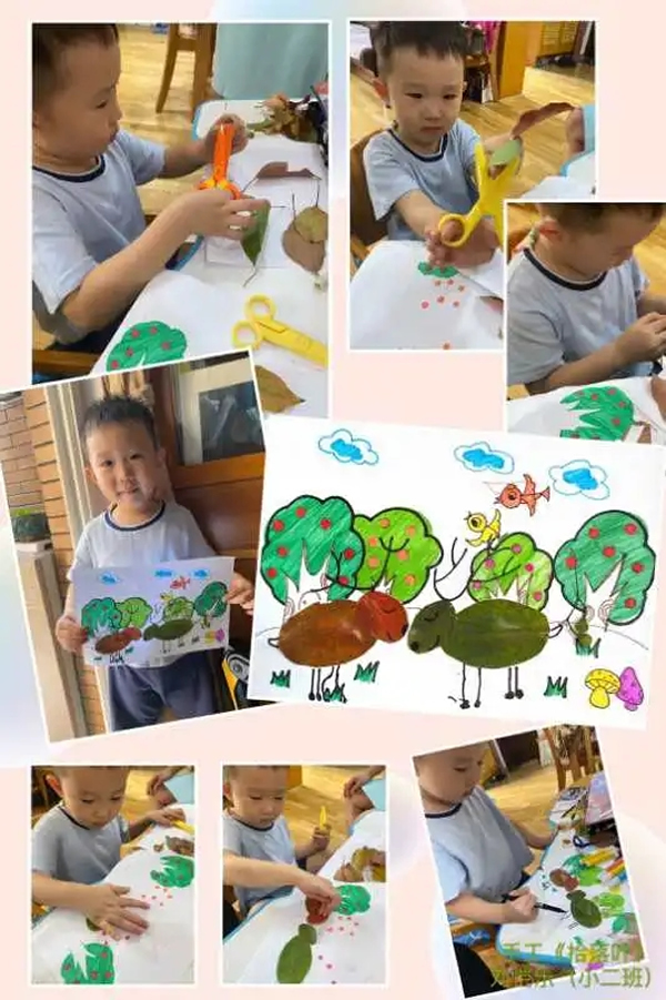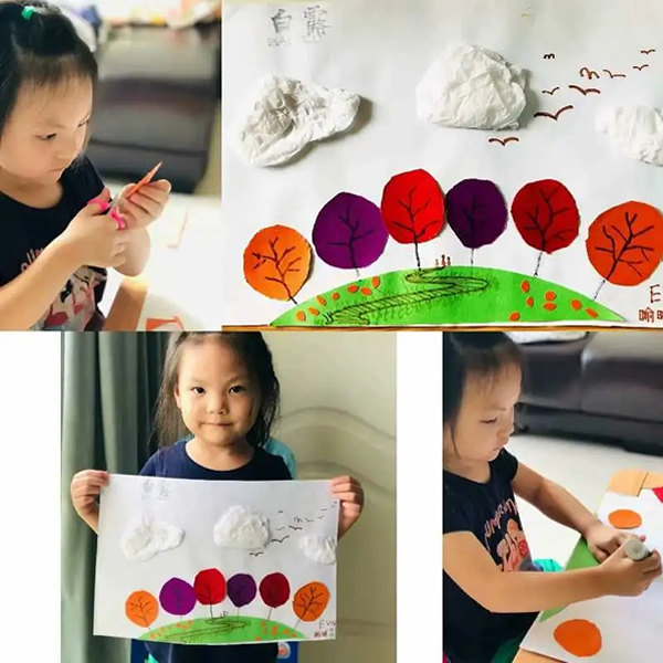 白露,也象征著秋季的到來。到了秋天會有許多的落葉 ,這些落葉形態不一 ,千變萬化,葉子上還有許多的葉脈呢。家長帶著小朋友一起拾一些漂亮的落葉,并觀察他們的形狀、顏色有什么不同。拾到的落葉可進行二次創作,將會是一幅幅漂亮的落葉拼圖畫。