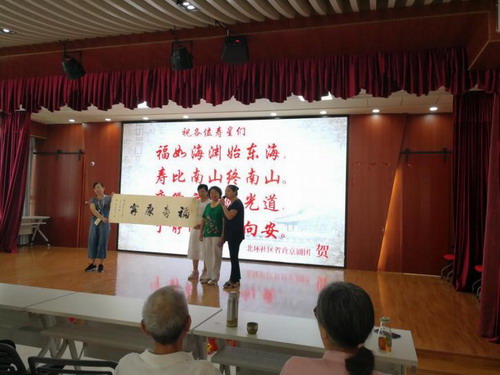社區省直京劇團的董老為老壽星們帶來了京劇《工人們把碼頭面貌改》,字正腔圓,精神矍鑠,其人老心不老的精神狀態,為在場的老壽星們作出了老有所為、老有所樂的表率。董老還為老壽星們帶來了一首祝壽詩: