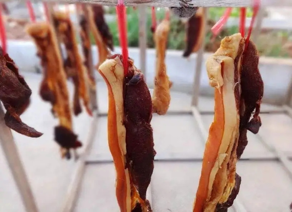 大雪節氣一到,一些地方家家戶戶忙著腌制“咸貨”。將大鹽加八角、桂皮、花椒、白糖等入鍋炒熟,待炒過的花椒鹽涼透后,涂抹在魚、肉和光禽內外,反復揉搓,直到肉色由鮮轉暗,表面有液體滲出時,再把肉和剩下的鹽放進缸內,用石頭壓住,放在陰涼背光的地方。半月后取出,將腌出的鹵汁入鍋加水燒開,撇去浮沫,放入晾干的禽畜肉,一層層碼在缸內,倒入鹽鹵,再壓上大石頭。十日后取出,掛在朝陽的屋檐下晾曬干,以迎接新年。
