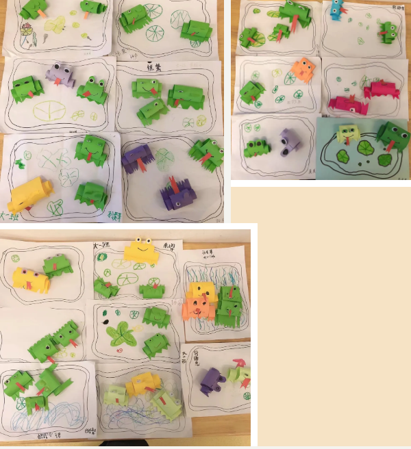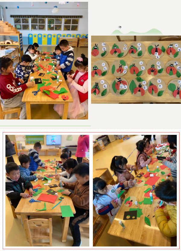 幼兒自己動手折疊樹葉、剪好圓形,進行張貼成七星瓢蟲,再進行裝飾。