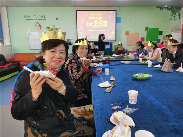 本次活動在一首歡快而又溫馨的歌曲中拉開了帷幕,壽星們滿懷喜悅的圍坐在一起,志愿者為老人們戴上了壽星帽?,老壽星們上臺與大家共唱生日歌、吹蠟燭、切蛋糕,共同許下美好的生日愿望,隨后,老人們一邊品嘗著社區(qū)志愿者們精心準(zhǔn)備的零食、蛋糕,一邊閑話家常,現(xiàn)場氣氛溫情融洽,溫馨又充滿歡樂。參加活動的張秋蘭張阿姨感慨的說:“我從來也沒想到還能過這樣的生日,這一切都得感謝社區(qū),第一次有這么多人給我過生日,也感謝黨感謝國家讓我們過上今天這樣生活無憂的好日子!”。