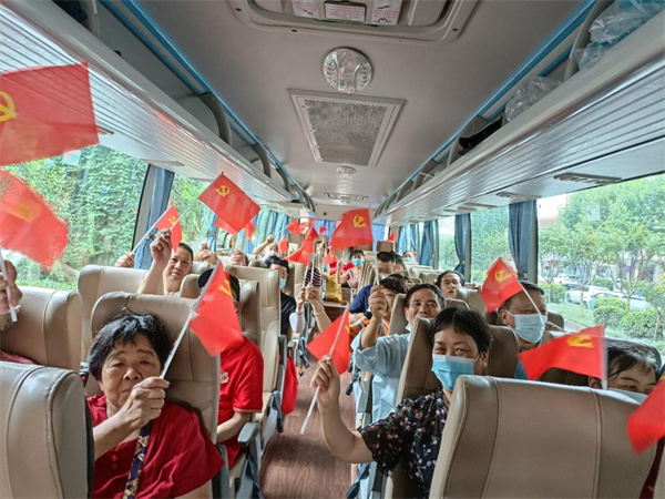 早上七點半,國棉社區的黨員們與木蘭花社工一起將大家的能量包(水和干糧)運上大巴。八點半大巴車準時出發,出發啟動以后,每個人發了一面小黨旗。隨后就開始了有關黨建的有獎問答,現場氣氛特別活躍。一路上大家唱著《沒有共產黨就沒有新中國》與《團結就是力量》到達了目的地。