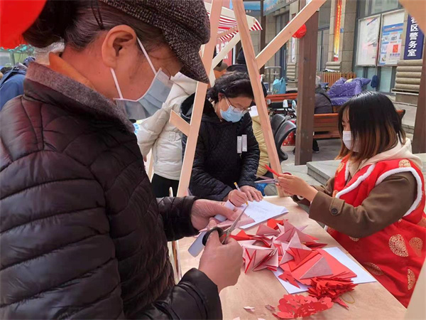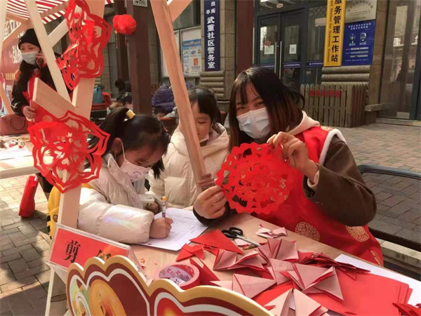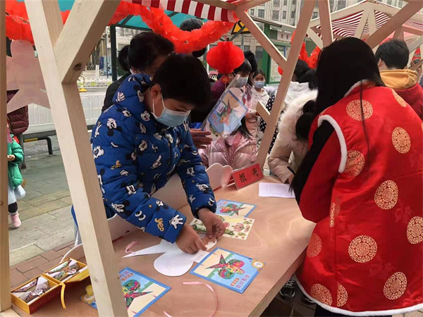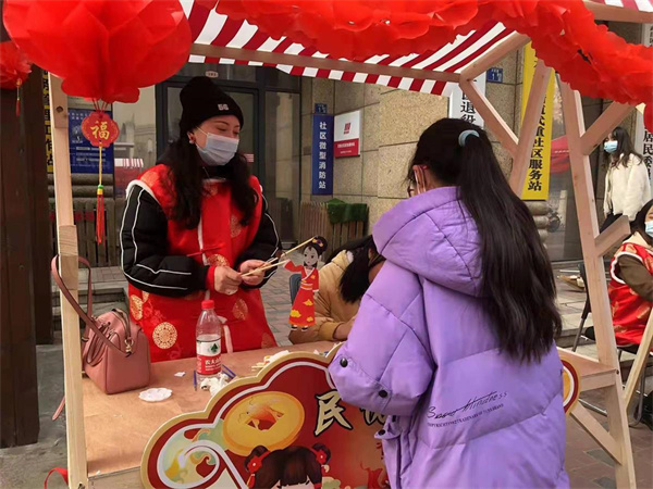當天下午,武重社區居委會門口張燈結彩,人潮涌動。寫春聯、剪窗花、皮影制作、糖畫、糖葫蘆、畫紙鳶、套圈等攤位,吸引了越來越多的居民。大家自主選擇想要體驗的非遺項目,讓原本顯得“高冷”的“非遺文化”更接地氣。