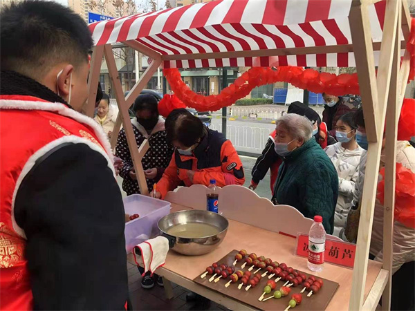 糖畫和糖葫蘆的攤位前排隊的人很多,這是中、老年居民關于童年的美好回憶。糖畫傳承老師為大家燒好糖漿,一只只小動物形狀的糖畫在老師熟練的繪制中活靈活現??諝庵袕浡鹛鸬南阄?,大家領取到糖畫和糖葫蘆后,開心得合不攏嘴。
