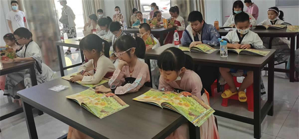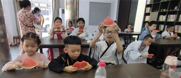 參加此次活動的青少年提前穿搭好精致的漢服,為此次活動帶來古風(fēng)氛圍。在老師生動有趣的講述下,大家學(xué)習(xí)了《立秋》繪本內(nèi)容,知道“啃秋瓜”“貼秋膘”和“摸秋”這些有趣的習(xí)俗。活動現(xiàn)場,社區(qū)工作人員還為青少年提供了美味的西瓜,一起體驗(yàn)“啃秋瓜”,來消暑解熱和祈求美好祝福。