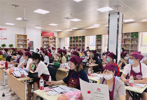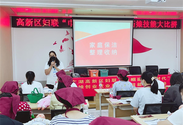 本次活動采用“先理論 后實操”的方式展開。來自木蘭花職業技術培訓學校的高級培訓講師,從育嬰技能、家政收納、養老護理等方面對學員展開基礎理論知識培訓。隨后,活動現場展開了“育嬰”實操比武,學員們熱情高漲,展開激烈比拼。