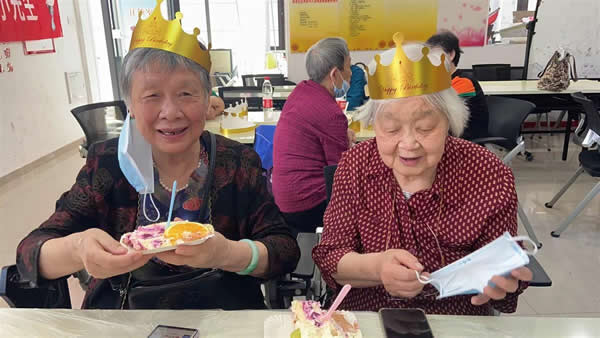 在等待重陽糕蒸熟期間,工作人員為第三季度過生日的老年人準備了生日蛋糕,伴隨著“祝你生日快樂”的旋律,老人們戴上了漂亮的生日帽,一位最年長的老人走到生日蛋糕前吹蠟燭、切蛋糕。老人們互相祝福生日快樂,大家祝福老人們健康長壽。