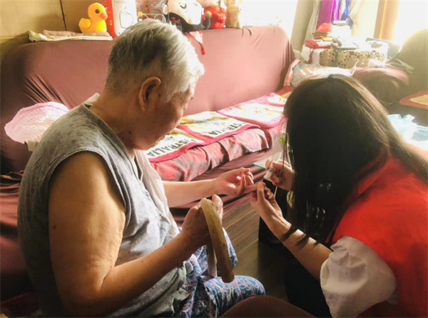 在活動(dòng)現(xiàn)場,社工志愿者們分別到老人家中,幫老人理發(fā)、按摩、量血壓和血糖,與老人們聊家常,送上節(jié)日禮品。