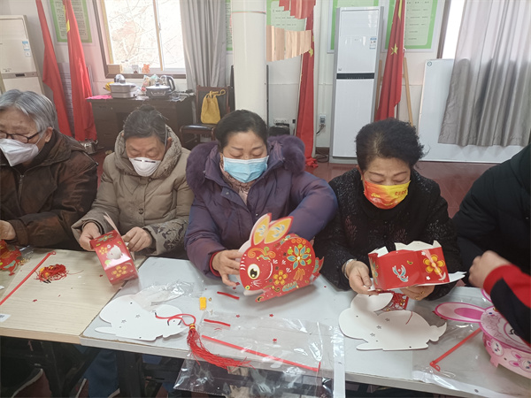 此次活動線上線下共計邀請到50多位居民代表參加?;顒蝇F場為居民準備了手工DIY兔年主題燈籠、有趣的猜燈謎、吃湯圓等活動環節,現場氣氛其樂融融,一派祥和。不得不說居民都非常厲害,稍加提醒便立馬悟出謎底,然后興奮來到工作人員身邊領取燈籠DIY材料包,不一會兒一個個精巧可愛的兔子燈籠便制作完成。手巧的金阿姨拎著自己動手完成的兔子燈籠開心的合不攏嘴:“看我厲害吧,一下就做好了,帶回去給我的小外孫玩,她一定很喜歡。”“感謝社區的精心安排,以后的活動我都要積極參加?!?/p>