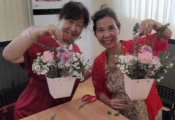 大家拿著剪刀把鮮花斜著剪出合適的高度,然后根據自己的喜好,在花籃的花泥中依次插入主花、配花。所有人都很認真,沉浸在花香中。一朵朵鮮花在居民手中綻放,粉色的玫瑰、熱情的波斯菊、溫馨的康乃馨、紫色的桔梗花、浪漫的滿天星、翠綠的尤加利,鮮花最終匯聚成一件件精美的作品。花藝DIY完成后,大家紛紛拍照留念。居民朱奶奶說:“感謝社區,感謝木蘭花社服機構,讓大家參加有意義的插花活動,豐富了大家的業余生活。”