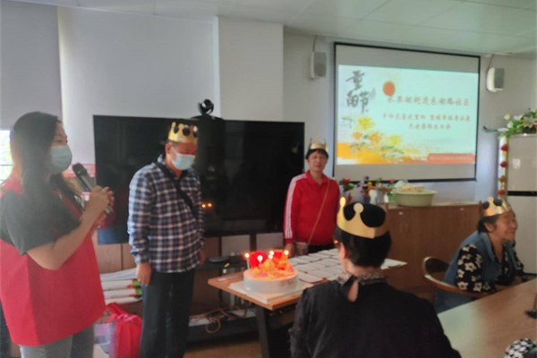 在互動游戲環節,老人們玩起游戲,掌聲、歡笑聲不斷。社工還開展了“有獎競猜”活動,與老人們互動,問答內容包括重陽節傳統文化、腦筋急轉彎、反詐騙知識等。最后,工作人員給壽星們戴上了生日帽,齊唱生日歌,和壽星們一起吹蠟燭,給大家分發生日蛋糕。老人們開心地吹滅了蠟燭,許下了美好的心愿。