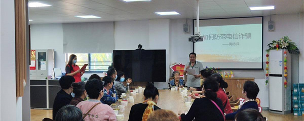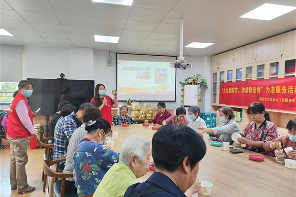 活動中,社區工作人員祝福老人們重陽節快樂,并開展“如何防范電信詐騙”講座,希望老人們守好錢袋子,安度幸福晚年。社工向老人們講述了重陽節的起源和習俗,隨后帶著他們一起做桂花蜜。大家在杯中放一層桂花,再放上一層白糖,重復操作至杯滿,封口前撒一層白糖,蓋起杯蓋,將密封好的杯子放入冰箱冷藏室即可。