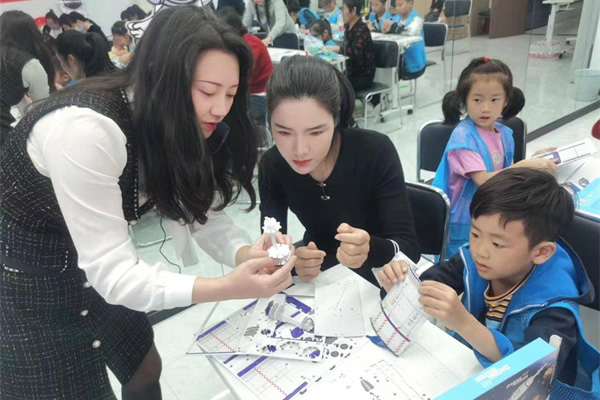 理論科普結束后,志愿者們向孩子們分發“長征運載火箭”、航天模型材料,小心翼翼地將火箭箭體、助推發動機、尾翼等組裝到一起。在老師的指導下,陳璟瑤小朋友第一個完成了閃閃發光的運載火箭。“哇,快看!我的火箭做成功啦!這太神奇了,以后我也想當一名科學家!”她一邊將自己的作品展示給其他小朋友看,一邊激動地說。完成作品后,大家手里拿著老師發的繪本和火箭模型,非常興奮,現場歡聲笑語一片。