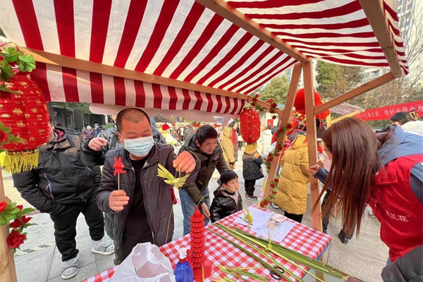 畫糖畫、手工草編、剪窗花、捏泥人……對許多居民來說,這些“小時(shí)候的專屬記憶”,營造出濃濃的節(jié)日氣氛。小朋友們聚集在各個非遺民俗攤位前,排隊(duì)領(lǐng)取屬于自己和春節(jié)的那份“甜”;炸肉丸、寫春聯(lián)的攤位前也排滿了居民,等待他們的是一口熱乎的“團(tuán)團(tuán)圓圓”和新的一年美好的祝愿。