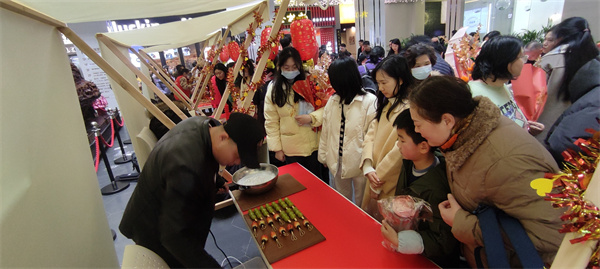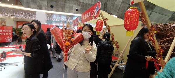 現場職工青年在糖畫前面排起了長隊,等著觀看非遺老師用晶瑩剔透的糖勾勒出的“龍”的形態,幸運的是還可以領取一份糖畫品嘗。有的青年職工在糖葫蘆前面排隊,領取可愛的水果糖葫蘆,回憶童年的味道。最近很火的毛根做柿子,也在現場開展起來。手工老師現場示范如何用橙色的毛根做個飽滿的柿子,并將柿子、冬青紅果、尤加利、銀杏葉等包扎成一束新年主題花束。熱愛生活的青年職工認真積極的學習著,不一會一束花就包扎好了,紛紛舉起手機拍照留念。套圈游戲也深受大家的喜愛,有的為套到的職工歡呼,有的為差一點套到的職工惋惜,熱鬧非凡。活動現場的王女士拿著自己套的龍年抱枕開心的說:“感謝水果湖街道黨建辦和長城匯物業開展這么有趣的活動,讓我們在新年來臨之際感受到了溫暖的關懷!”
