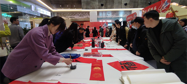 活動現場早早的布置起來,新年的氛圍在紅紅的燈籠點綴下越加喜慶。隨著青年職工休息的時間到了,看到這邊的迎新年活動,紛紛陸續參與其中。俗話說:無聯不成春,有聯春更濃?;顒蝇F場邀請了多名書法家揮毫潑墨為大家書寫精美的春聯和福字。老師們神情專注地舞動手中的毛筆,為大家書寫出一幅幅寓意吉祥、充滿喜慶的春聯和福字。老師們的精湛書法,引得現場青年職工陣陣夸贊。
