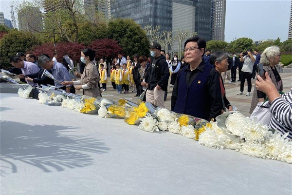 隨后,姚家?guī)X社區(qū)黨委書記袁學剛與專職副書記余珊帶領全體黨員和少先隊員在董必武紀念像前有序分批獻上花籃和鮮花。
