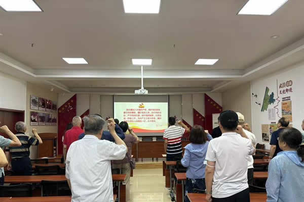當天,社區退役軍人活動室內熱鬧非凡,三十多位退役軍人及居民代表齊聚一堂。在社區黨委書記、退役軍人服務站站長何勃的帶領下,參加活動的黨員面對黨旗高舉右拳,重溫入黨誓詞,集中觀看學習視頻。