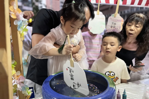 夏末秋初,居民們來到社區廣場,積極參與清涼節的各項活動。在手工體驗區,社區工作人員給孩子們講解漆扇畫的特點,現場演示如何利用現有材料進行創意制作。在游戲區,工作人員設計了幾款與水相關的游戲,用寓教于樂的形式宣傳防溺水,孩子們盡情玩耍。沙拉、龜苓膏、蜜豆綿綿冰,消暑食品讓大家大飽口福。