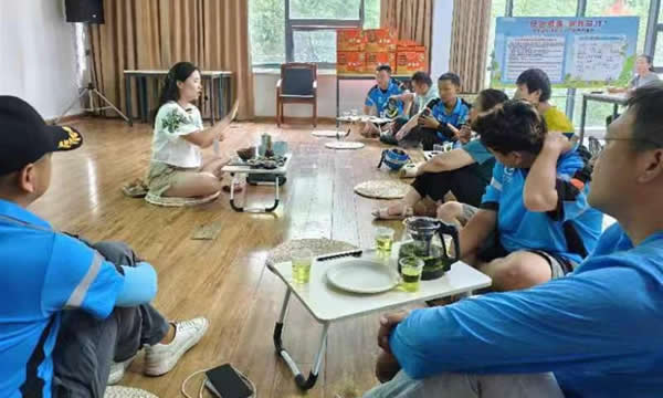 活動現場,茶藝師示范基本泡茶手法,講解茶葉知識及品茶禮儀。新就業群體坐在蒲團上,在茶藝師的指導下,親手泡茶,體驗泡茶的樂趣與專注。在悠揚的音樂中,大家品茗香茶,品嘗月餅糕點,分享生活感悟,釋放壓力與負面情緒,分享心路歷程,獲得心靈慰藉。