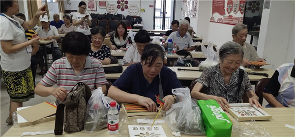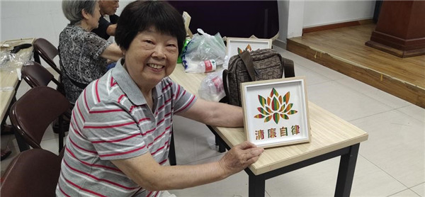 接下來,社工教現場黨員和居民制作清廉主題竹編畫。黨員和居民們跟著社工一起制作,先將膠粘在背板上,然后將彩色竹篾一次排開,在進行編制,不一會,一副精美的竹編畫就完成了。通過制作精美的清廉主題竹編畫,可以讓清廉理念更加深入人心。