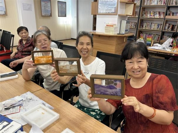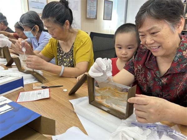 知識(shí)分享后,創(chuàng)意十足的流沙畫(huà)相框手工環(huán)節(jié)登場(chǎng)。兩種飽含美好寓意的顏色流沙畫(huà) —— 橘色 “背靠金山”、紫色 “紫氣東來(lái)”,成為居民們創(chuàng)作的主角。大家圍坐在一起,小心將細(xì)膩流沙注入古樸木框,看著流沙緩緩傾瀉、堆積,或勾勒出層巒疊嶂的山水輪廓,或暈染出夢(mèng)幻的色彩層次,原本普通的流沙,在巧手下變成獨(dú)特的藝術(shù)作品。創(chuàng)作過(guò)程中,居民們相互交流技巧、分享創(chuàng)意,歡笑聲與討論聲交織,讓社區(qū)活動(dòng)室滿(mǎn)是溫馨。