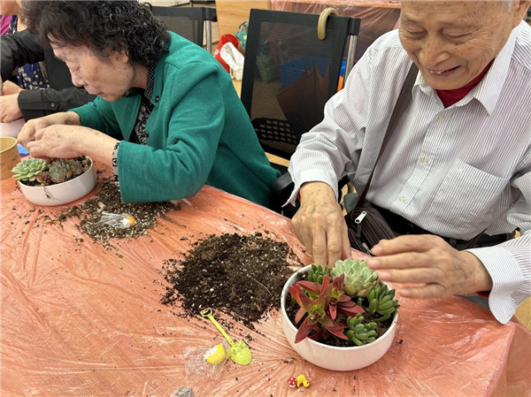 文化講解結束后,充滿趣味的多肉微景觀制作環節正式開啟。社區工作人員提前為每位參與居民準備了獨立的材料包,每份材料包均包含多肉植物、營養土、鋪面石、花盆以及造型各異的兔子擺件,同時邀請了專業園藝老師現場提供一對一指導。居民們各自專注于手中的創作,有的仔細篩選多肉品種,搭配出層次豐富的組合;有的耐心調整營養土濕度,確保多肉扎根生長;有的則反復斟酌兔子玩偶的擺放角度,力求呈現出最佳視覺效果,再細致地撒上鋪面石勾勒細節。創作過程中,大家不時與身邊鄰里交流心得,向園藝老師請教養護技巧,現場氛圍熱鬧而溫馨。經過近一個小時的精心打造,一個個充滿生機與巧思的多肉微景觀新鮮出爐,翠綠的多肉搭配靈動的兔子玩偶,既飽含中秋 “玉兔伴月” 的美好寓意,又充滿自然生機,居民們捧著屬于自己的專屬作品,臉上洋溢著滿足的笑容。