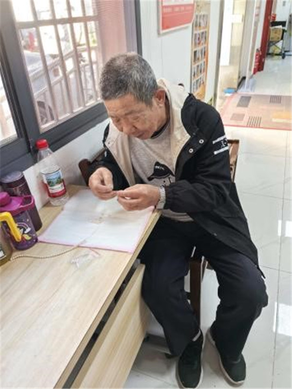 阿姨選的位置特別好,這顆珍珠最亮,戴在脖子上肯定好看!”穿珠的過程中,老人們漸漸打開了話匣子。85歲高齡的黃爺爺邊穿珠邊回憶:“我老伴年輕的時候就喜歡珍珠,可惜那時候條件不好,沒給她買過。”志愿者聽了,悄悄幫他選了幾顆光澤更柔和的珍珠:“爺爺,咱們把這條項鏈做好,送給奶奶當驚喜吧!”活動室里不時傳來陣陣笑聲,有的老人互相“炫耀”自己的作品,有的則跟著老師學習編花樣,指尖的珍珠在陽光下流轉,映著老人們臉上的笑容,格外動人。