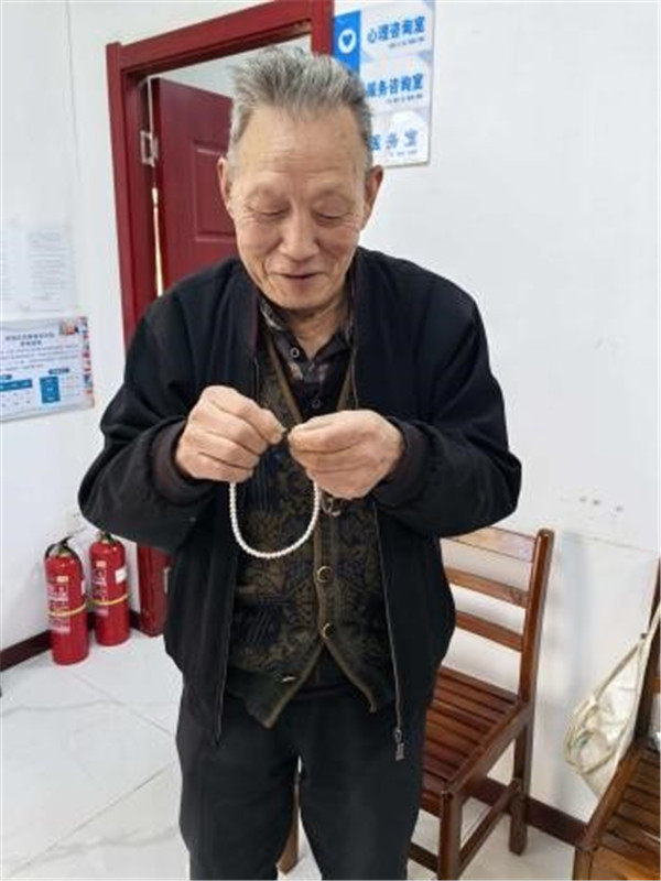 活動接近尾聲,老人們都完成了屬于自己的珍珠項鏈。看著手中串好的項鏈,王奶奶輕輕摸了摸珍珠,眼眶有些濕潤:“好久沒這么開心地做過手工了,謝謝你們還想著我們這些老人,這條項鏈我要好好戴著。”志愿者們還貼心地幫行動不便的老人把項鏈收好,叮囑他們回家后可以搭配喜歡的衣服。
