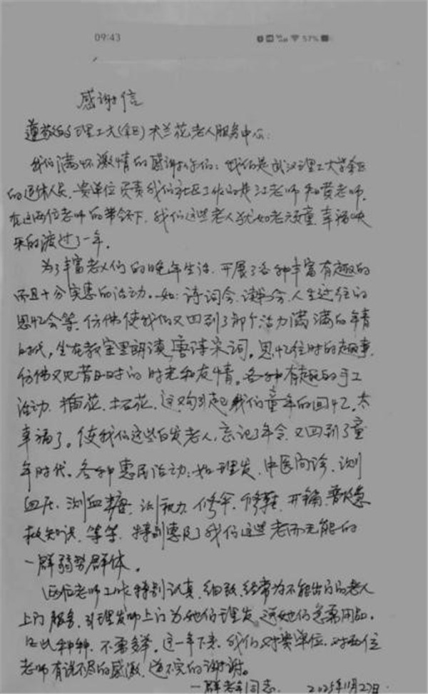 近日,理工大水運社區(qū)老年服務中心的辦公室里暖意融融,接連收到的一面鮮紅錦旗與兩封字跡工整的感謝信,成為了這個冬日里最動人的風景。這些承載著老年居民深厚情誼的“禮物”,不僅是對服務中心工作的高度認可,更生動詮釋了“社區(qū)為老、情暖萬家”的服務溫度,為寒冷的冬日注入了陣陣暖流。