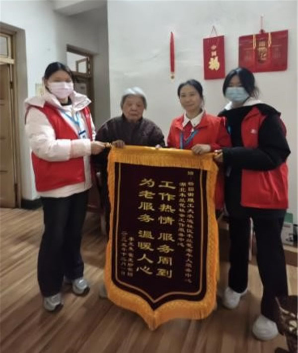 12月1日下午三點,服務中心的黃老師帶著兩位同事,拎著剛采購的刀削面,熟門熟路地來到社區(qū)南3棟301室——這是他們每月至少四次的固定探訪。屋內,長期臥床的李光生爺爺正靠在床頭,膝蓋患有嚴重關節(jié)炎無法下樓的霍光珍奶奶則在一旁等候??吹焦ぷ魅藛T進門,霍奶奶連忙起身迎接,眼角滿是笑意。令眾人意外的是,這次探訪中,霍奶奶顫巍巍地拿出一面繡著“工作熱情 服務周到 為老服務 溫暖人心”的錦旗?!斑@一年多虧了你們,小到降壓藥、醬油醋,大到夏天的電扇、冬天的暖手袋,全靠你們跑前跑后,連家里壞了的電飯煲都是你們找人修好的。”霍奶奶的話語樸實無華,卻道出了老兩口最真切的感激。
